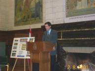手拿着印有“我支持法轮功”T恤衫的联盟党国会议员安德士指出:他很高兴看到越来越多的议员、各界人士声援法轮功。安德士先生是1999年最早公开站出来声援法轮功的国会议员之一。面对中国大使馆不断给他写信、邮寄污蔑和诋毁法轮功的材料,他除了给加拿大总理、外交部长不断为法轮功写信呼吁外,还亲自去所在选区的中国驻加拿大领事馆递信。