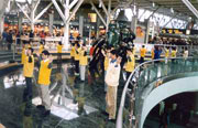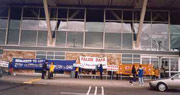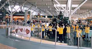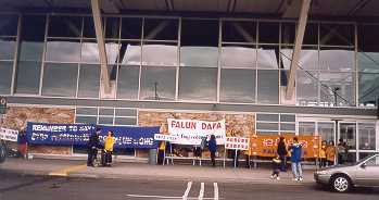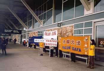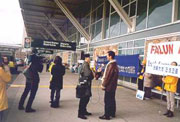 二月九日是Team Canada起程访问中国的日子。一大早,学员们便在通往温哥华国际机场的公路旁竖起了醒目的大标语:“帮助停止中国对法轮功的镇压!(Help! Stop Persecuting Falun Gong in China)”。四十多位学员,个个穿着停止镇压法轮功的黄体恤,高举着“请记住说:停止镇压法轮功(Remember to Say: Stop Persecuting Falungong)”“法轮大法是正法”等标语站在国际机场的登机厅门口,吸引了许多游客的注视。尤其当中国国际航空公司的机组人员到来时,学员们都面带笑容迎着他们,尽管他们受中国媒体的毒害不敢接触我们,但大法弟子的风范肯定给他们留下了深刻的印象。