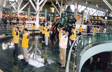 机场特地为我们安排了一个既接近中国民航登机口又视野开阔的练功场地,几十名学员在优美的炼功音乐中向机场乘客演示了五套功法。许多中,英文媒体都对我们当天的活动进行了采访。