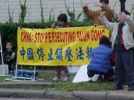 【明慧网2001年2月13日】 二月十一日下午两点三十分,休士顿法轮功学员在中领馆前召开有关澄清自焚真相记者说明会。中领馆前挂了许多横幅,如:中英文写的“法轮大法---真,善,忍”,“中国:停止镇压法轮功”,以及中文强烈要求彻查天安门自焚事件真相,还有各种图片等。休士顿第二十六电视台,第三十九电视台,和英文报社Chronical准时赶来采访,他们记下各种横幅上的中英文,然后采访了部分学员。学员们将早已准备的一些有关澄清自焚的资料递送给这两电视台及报社,学员也回答了他们的提问。数几十名学员向他们展示法轮功的五套动作,任何时候学员们都是以真,善,忍,为修炼原则,反对任何形式的杀生。整个说明会过程中,学员们一直处在祥和、宁静的能量场之中。
