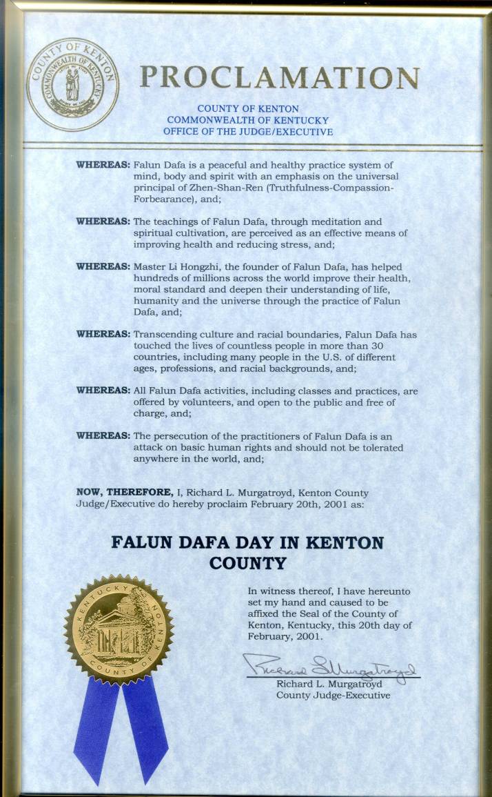 【明慧网2001年2月13日】 肯德基州坎顿郡宣布2001年2月20日为“法轮大法日”