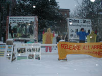 华盛顿DC大法弟子在大风雪中来到中国大使馆前的天安门花园和平请愿,呼吁江泽民停止迫害法轮功。