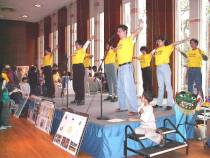 九日中午,约二十位学员陆续来到约定地点,布置了一条大法横幅,摆放了两块简洁明了的展板,大家便开始集体炼功。周围热闹非常,联欢会场人们排着长队领取免费午餐,并等待欣赏演出,过往行人络绎不绝,走过我们时,都不由地被这里的祥和与宁静所吸引,投来新奇的眼光,不时有人驻足观看。