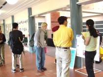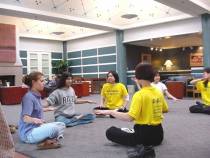 另有几名年轻的女学生在联欢会结束时来到展板前,看过后马上表示要学功。其中一位印度女孩学法轮周天法时感觉到背后有能量流呼呼地通过,双盘的动作也尤其标准,真是令人惊讶。另一位亚裔女孩同样可以双盘,并高兴地说感觉真好,临走时告诉学员要把大法介绍给自己的朋友。望着她们欢喜离去的背影,学员们互相感慨,真是有缘人哦,我们需要做的就是把大法呈现到她们面前而已。