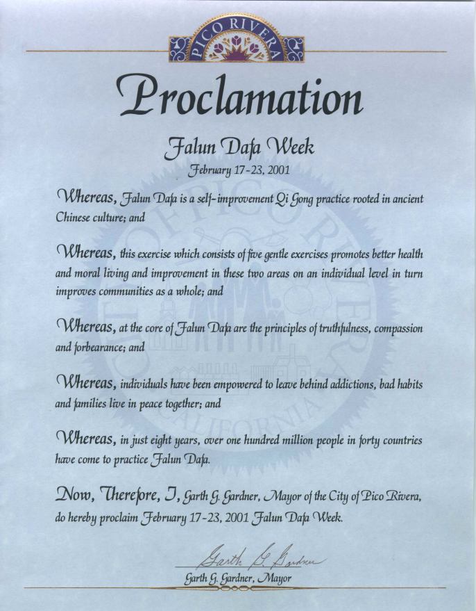 因此,我,格斯.格德纳,皮克.利弗拉市市长在此宣布2001年2月17-23日为法轮大法周。