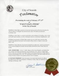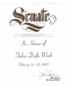 【明慧网2001年2月23日】 加州州议会第8选区参议员认证2001年2月16日至23日为法轮大法周