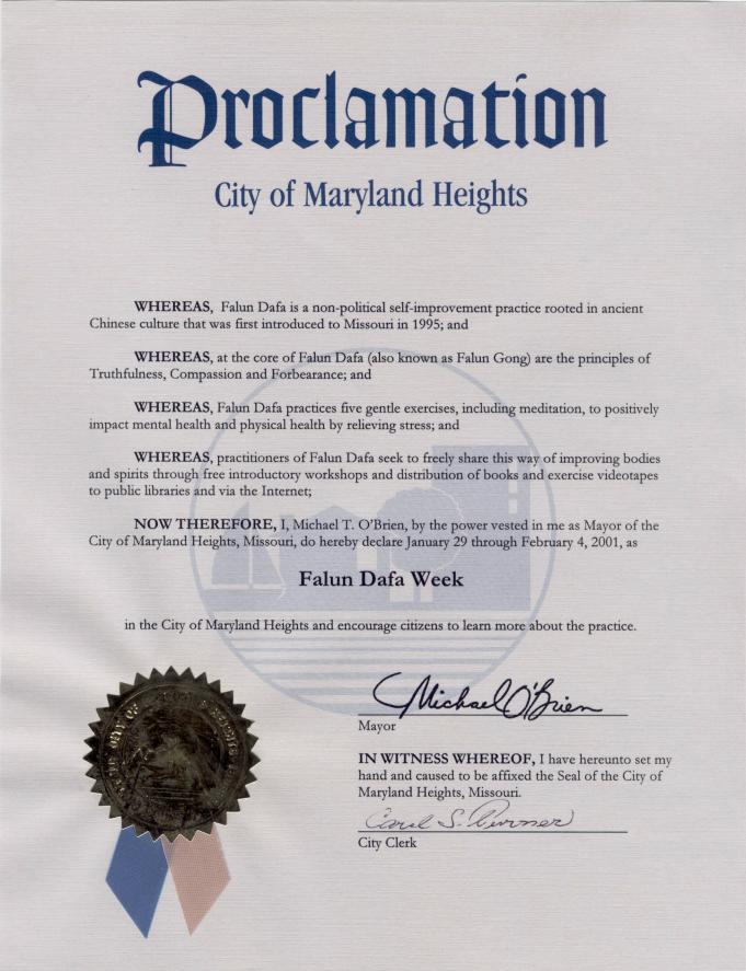 【明慧网2001年2月23日】密苏里州马里兰高地市市长宣布2001年1月29日-2月4日为“法轮大法周”