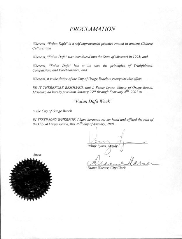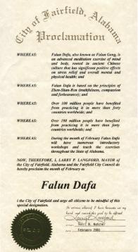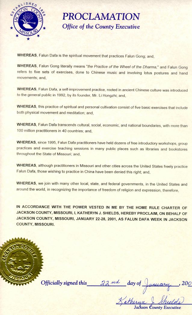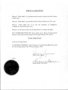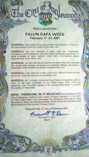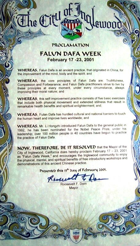 因此,现在,我,加州英格伍市市长,宣布2001年2月17日至23日为本市的法轮大法周,并且鼓励本市所有的市民踊跃参加法轮大法介绍班,同享这个古老的中国的修炼方法在身、心、灵方面带来的巨大益处。