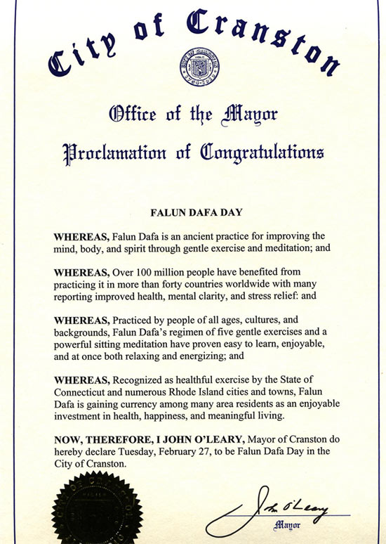 罗德岛州科峦斯顿市宣布“法轮大法日”