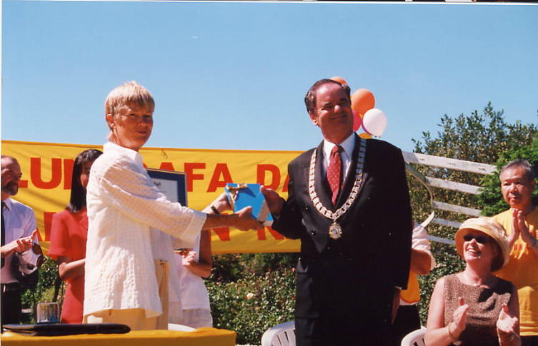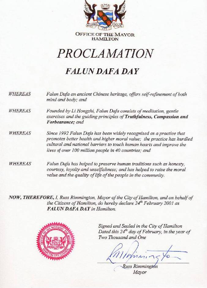 市长先生在听取了部分大法学员的修炼体会,观看了学员们展示的法轮大法五套功法之后,高度赞扬了法轮大法,当场签发证书,宣布2001年2月24日为汉密尔顿市法轮大法日。之后市长先生接收了学员们赠送的英文版《转法轮》。这是新西兰的第一个法轮大法日。褒奖令的授予,向世人展示了法轮大法正在得到愈来愈多的人民及政府的理解和支持。
