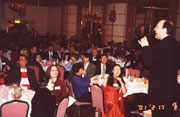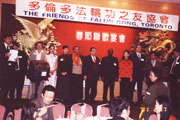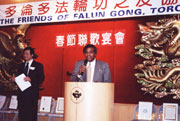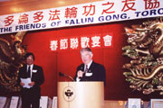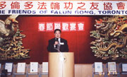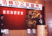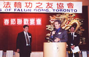 【明慧网二零零一年二月二十八日】 二月十六日晚,在美丽平和的多伦多,近四百人欢聚在中区华埠的枫城酒楼,参加由大多伦多地区八十多个不同族裔的社会团体组成的“法轮功之友协会”主办的春节晚宴,许多国会议员、省议员、市议员、市长、联合国驻加拿大官员等政要及律师、侨界人士、大学校长等社会名流、神父等宗教人士都参加了这一盛大的聚会,并在会上发言,表达了他们对中国政府残酷镇压法轮功的关注和谴责。安省中华总会馆主席陈荫庭以个人身份参加了这一晚宴。