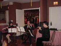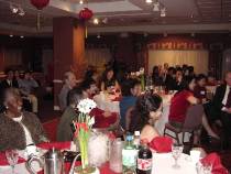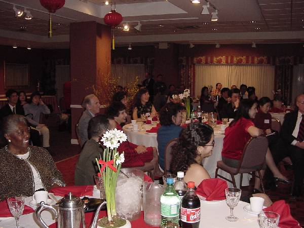 宴会当天,一些学员很早就去帮忙布置,步入大厅,不由得眼前一亮:象牙色的桌布上衬托着红色的餐巾,桌子中间用红巾包起来的转盘上衬托着一盆花白得一尘不染,叶与茎绿得晶莹剔透的水仙。大厅正门对面的红色落地窗帘上,一个大大的金色的“春”份外醒目。整个晚宴的布置喜庆、典雅;气氛祥和、愉快。许多女学员穿上了漂亮的旗袍,一位西方男学员也特意穿了一件中式黑底上衬托着龙凤呈祥的棉袄,别具风味。