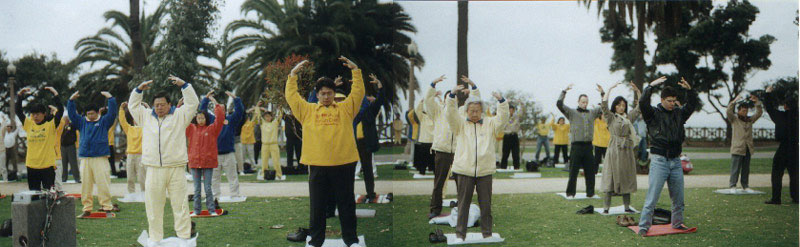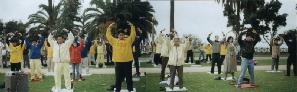 2001年2月19日是洛杉矶美西法会的第三天,也是美国的总统纪念日。一大早,五、六十名来自加拿大、香港、拉斯维加斯、美国其他各州、澳大利亚,以及洛杉矶当地的大法弟子,来到了风景如画的圣塔·莫尼卡海边炼功洪法。虽然天气微寒,但是大法弟子认真专注地演炼五套功法,海风中大法的音乐温暖着周围每一个人的心,许多游客都忍不住停下脚,跟着学炼起来,现场一片祥和宁静。