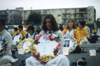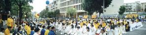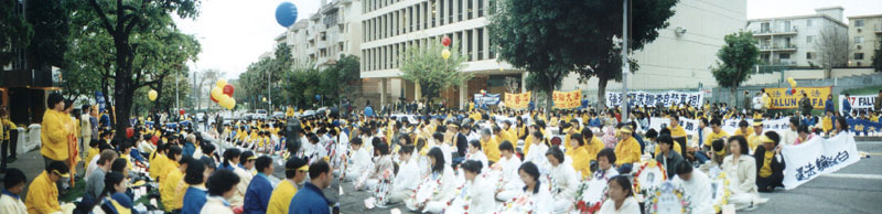 十许时,当炼功结束时,弟子们商量着要举行一个小游行,因该市法律十分宽厚,此类游行无需事先申请,大家想临时组一个游行小队,主题为:为人权而走。怎料天空悄悄地飘起雨来,而且越下越大。大家静下心来,衡量了一下,决定不受天气干扰,依然举行游行。在这样严肃的历史时刻,每一分每一秒都是师尊有巨大付出为众生们换来的,我们要珍惜这每一分每一秒,走出人的观念,更努力地向世人讲清真象。有了这样的共识,大家迅速行动起来。一位洛杉矶当地的同修热心地为大家送来气球打气筒、大法报纸和横幅,大家分工合作,很快地制作好五彩缤纷印着“法轮大法”的气球。举横幅的举横幅,拿报纸的拿报纸,无需任何人指挥,大家自发地互相配合,不出多久,一个庄严神圣的游行小队就准备出发了。