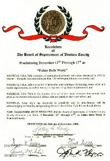 【明慧网2001年3月13日】 加利福尼亚州温图拉郡宣布2000年12月11-17日为“法轮大法周”