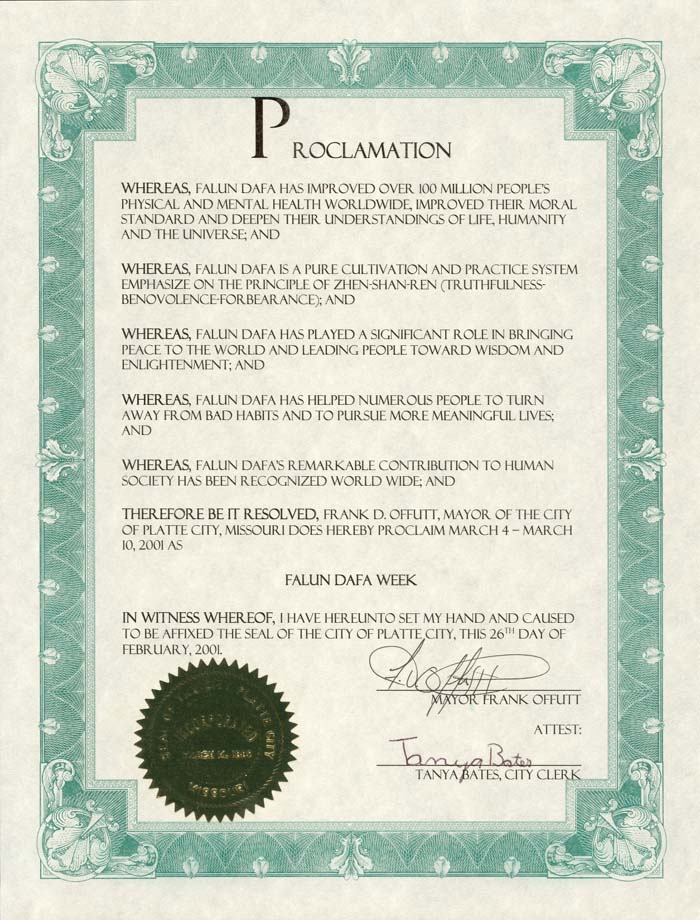 【明慧网2001年3月14日】 密苏里州帕雷特市宣布2001年3月4-10日为“法轮大法周”