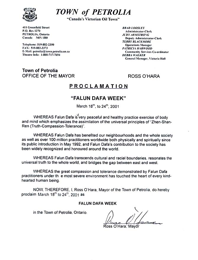 【明慧网2001年3月18日】 加拿大安大略省佩托利亚镇宣布2001年3月18-24日为“法轮大法周”