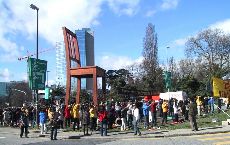 3月19日周一上午,来自欧洲及世界各地的一千多名法轮功学员在日内瓦联合国总部前的两个大草坪上炼功请愿,呼吁联合国及国际社会继续关注中国政府对大陆法轮功学员基本人权的严重侵犯,并帮助制止江泽民一夥的已持续近两年的对法轮功学员的犯罪行为。