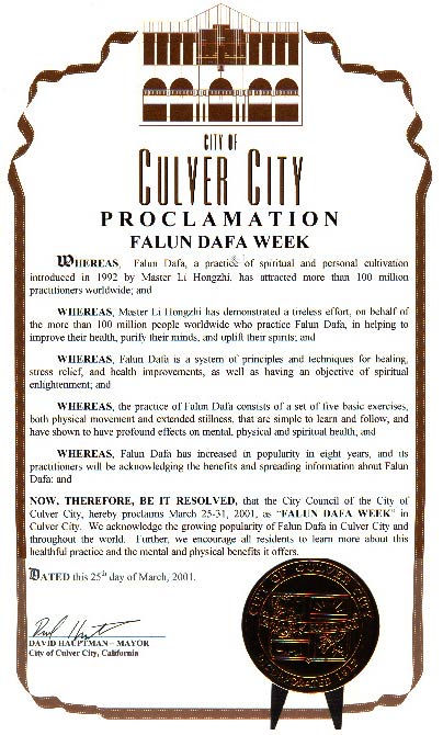 【明慧网2001年3月27日】加利福利亚州卡瓦市宣布2001年3月25-31日为“法轮大法周”。
