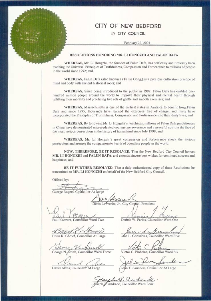 麻萨诸塞州新百得福市褒奖李洪志先生和法轮大法