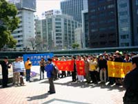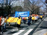 三月四日举行了集体炼功和讲清真相的游行活动。根据天气预报,三月四日大阪有雨。正如天气预报所说的,当天凌晨开始下起了大雨。有的学员担心当日的洪法活动受阻,但更多的学员讲:放心吧。因为以往几年来,每次大型的洪法、讲清真相的活动时,从来没有因天气受阻过。尽管有几次在活动开始前刮着风下着雨,但一到活动开始时就会风静雨停。果然,早上8点,学员们准备出发去炼功时,雨开始停了。10点左右,学员们在中之岛公园举行炼功时,蓝蓝的天空出现了,而且柔和的阳光洒落在学员身上。在炼功音乐的伴随下,一片祥和宁静的氛围。12点15分~45分,进行了记者会见。鹤园先生代表学员进行了简短的发言,指出天安门自焚事件乃中国政府制造的阴谋,呼吁国际社会对大法给予支持,对自焚事件进行第三者调查。下午1点,游行开始,有120名学员参加了今天的活动。大量的横幅和照片向世人揭露着国内大法学员所遭受的残忍迫害。几名学员随着队伍向路人散发真相传单,进一步讲清真相,证实大法。几辆张贴着大法宣传画的汽车为游行增添了几分色彩,更加有效地宣传了大法。路人纷纷停下脚步观看照片和阅读报纸。可想而知,其中又有多少人因此结缘得法。