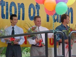 接着市议员们上台为庆祝法轮大法日进行了剪彩,泰勒议员高兴地向大家挥舞着手,表达着他那发自内心的对法轮大法的支持。几个天真的孩子为议员们献上了盛开的鲜花,以感谢他们对正义的支持。活动中还有几位学员与大家分享修炼的体会,其中一位西人学员讲到:我们西方人是很幸运的,因中国有非常悠久的历史,在这里我们一下就接触到了最正的气功-法轮功……