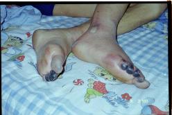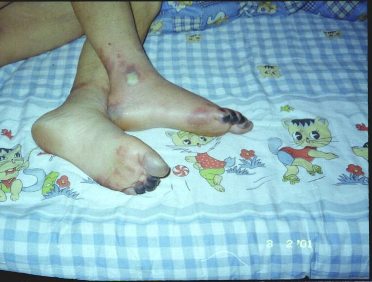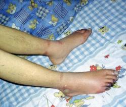 法轮功学员的手段之一是让学员脱了鞋袜、衣服在寒冷中挨冻。这是一名法轮功学员被冻坏的下肢。这位学员被释放多日后仍不能行走。