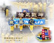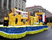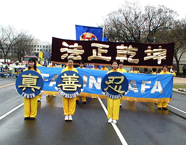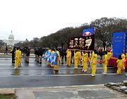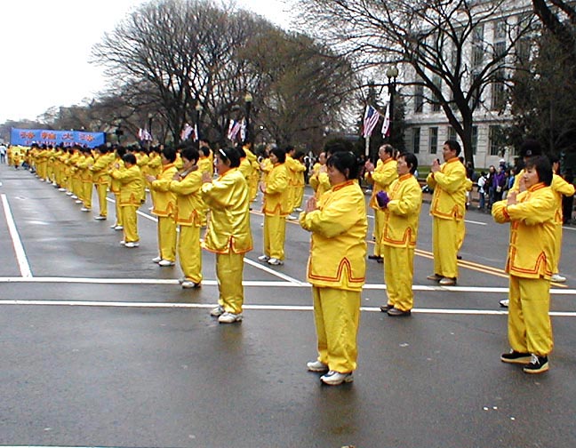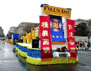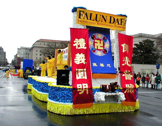 从上午8点左右开始,六、七十支游行队伍、数千人在美国国会山庄前的大草坪上集会,整列队伍。法轮功学员也纷纷搭好了花车、竖起了横幅。横幅上面大书“法轮大法”、“法正乾坤”、“佛光普照,礼义圆明”等大字,格外醒目。