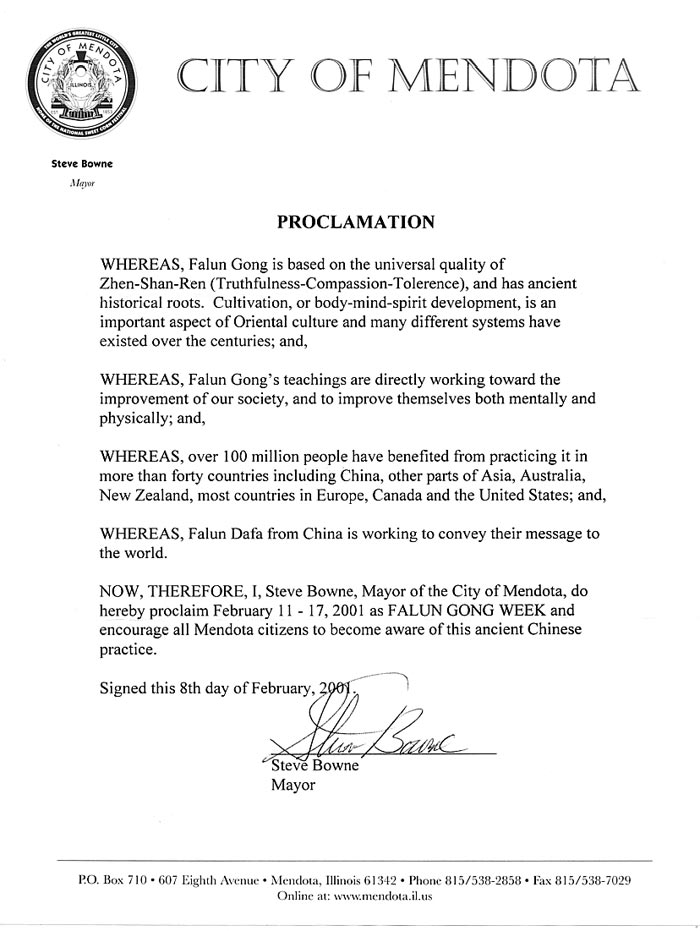 【明慧网2001年4月1日】 伊利诺州曼多塔市市长史缔夫鲍尼宣布2000年2月11日至17日为法轮功周并鼓励所有曼多塔市市民关注这一中国古老修炼方法。