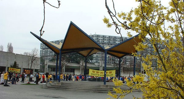 Cite Lignon是一片很大的集中住宅区,高层的住宅楼呈弧形连绵约有一公里长。在其长长的商业一条街前面的空地公园,绝大部分学员在炼功,几位瑞典、瑞士和华人学员一同,不断地向往来的放学的学生、购物的顾客、散步的居民等,散发法轮功介绍材料,因为当地是法语区,当地以外的华人学员大都只能讲英语,遇到介绍不了的时候,就会有当地的西方人学员或华人学员前来协助,很多天真可爱的儿童微笑着学法轮功学员合十的动作。