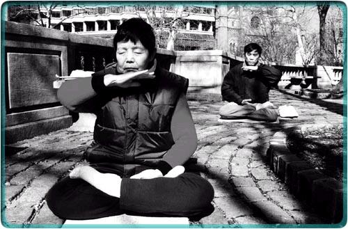 在一个特别阴沉的周日上午,包括华人和白人的八位费城居民,在里登大楼广场中心盘腿打坐,他们闭目静听录音机里发出的中文国语口令,正在炼最后一套功法----一小时打坐静功。
