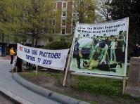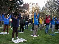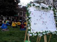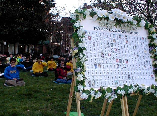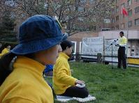 大华府地区法轮功学员在中国大使馆门前举行了烛光悼念活动。从下午5点至晚上9点,五、六十名学员陆续聚集在中国大使馆门前的天安门花园。大家首先集体炼功,虽然春寒料峭、寒风刺人,但是大家依然庄重肃穆。