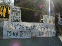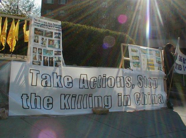这次活动的主题是“行动起来,制止屠杀”以及“呼唤人道主义援助”。学员们打出了许多横幅,如“法轮大法是正法”、“出卖国土,镇压无辜,人神共愤”、“法轮大法好”、“江泽民血债累累,难逃历史的审判”、“江泽民政府停止迫害法轮功”等等。安放在正中间的是一个洁白的花圈,上面有190位死去学员的照片和名字。许多驶过的美国人纷纷以汽车鸣喇叭的方式表示对我们的赞许和支持。不少学员向过往行人征集签名,许多人在简单询问之后就爽快地签了名,使这个世界又多了一个有希望和未来的善良人。