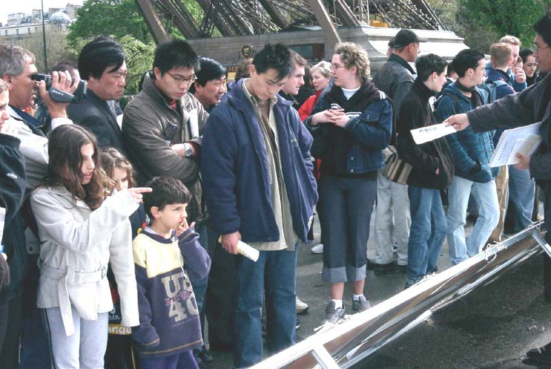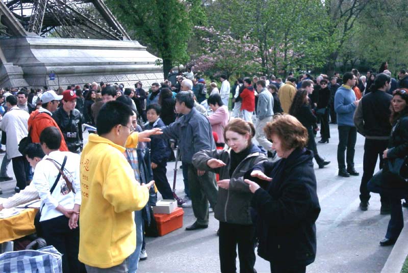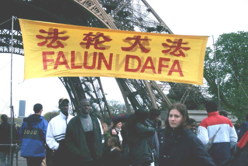 【明慧网2001年4月19日】在日内瓦人权会议休会期间,部分大法学员在巴黎埃菲尔铁塔下炼功洪法,传播法轮功真相,揭露邪恶。