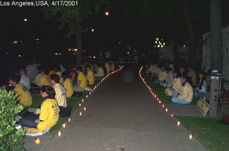【明慧网2001年4月19日】 4月17日晚近百名洛杉矶法轮大法学员在中领馆前烛光悼念被江泽民犯罪集团迫害致死的大陆学员。
