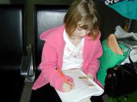4月11日在啊姆斯特丹候机室遇到一位西人小姑娘和他的父母,学员将一个写有中英文“真 善 忍”的精美书签送给她,小姑娘欣喜的把书签给妈妈看。并在画本上仿照书签的字,写下中英文“真Truth 善Compassion 忍Tolerance"(见照片)