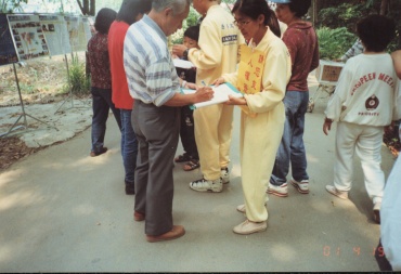 在日内瓦国际人权会议前夕,我们接获需要大家签名支持法轮功,呼吁社会各界制止江泽民及其追随者对我们学员的迫害。四月十五日上午炼完功时,几个同修商量决定到假日人潮最多的「中兴农场」征求签名。我们抵达现场时,看到新营炼功点的学员,装备齐全,早已把场地布置好,在入口处的路边架上大法相关说明图文,包括大陆学员被迫害资料,使我们很惭愧,事先什么都没准备。新营的黄先生和我们点上辅导员王先生,轮流手持麦克风,说明真相,大声呼吁往来群众签名支持我们,学员们也积极地上前一一解说,得到很好的效果,签名的人很多,络绎不绝的人潮,有很多都是携老带幼的一家人同行,一签就是一家子,一早上短短几小时就签了好几百个,我感到这世上善良的人很多,祝福他们早得法。