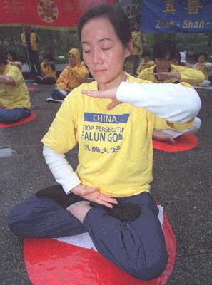 法轮功学员在中共驻纽约总领事馆前守夜练功——一群纽约法轮功学员昨晚六时起,在曼哈坦中共驻纽约总领事馆前,举行连续二十五小时接力守夜练功,纪念 一九九九年四月二十五日北京中南海法轮功学员大规模请愿活动两周年。