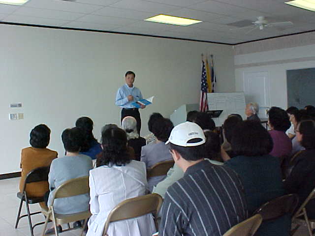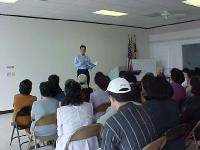阮医生的发言结束了。紧接着华裔大法弟子上台发言,他发言的主题是"法轮大法在世界。"让他们的思维从个人到世界;接着是"法轮大法在休士顿。"让他们知道休士顿还有很多炼功点,可以就近学炼;也可以以越裔组成,华裔弟子协助教他们。同时,告诉他们大法资料的来源,以及上明慧网等。最后华裔弟子展示法轮功的五套功法,这是他们等待已久的。他们被这优美缓慢的动作深深吸引住了,他们当场也跟着做起来了,人人都有一颗向往"真、善、忍"的心,整个场是那么宁静祥和。三个多小时的时间很快就过去了,他们还不想离去,因为这里清除了邪恶的毒害,已是一块人间的净土。