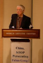 代表加州国会众议员兰托斯出席新闻发布会的特别助理伐若重点批评了中国政府无视国际人权以及对法轮功的严厉迫害。她指出,最近由兰托斯议员为主,提议国际奥委会不考虑中国申办二零零八年奥运会申请的议案不仅在议会得到通过,也得到了联合国人权组织的认可。她在发言中还就中国的人权纪录进行了强烈的抨击。