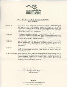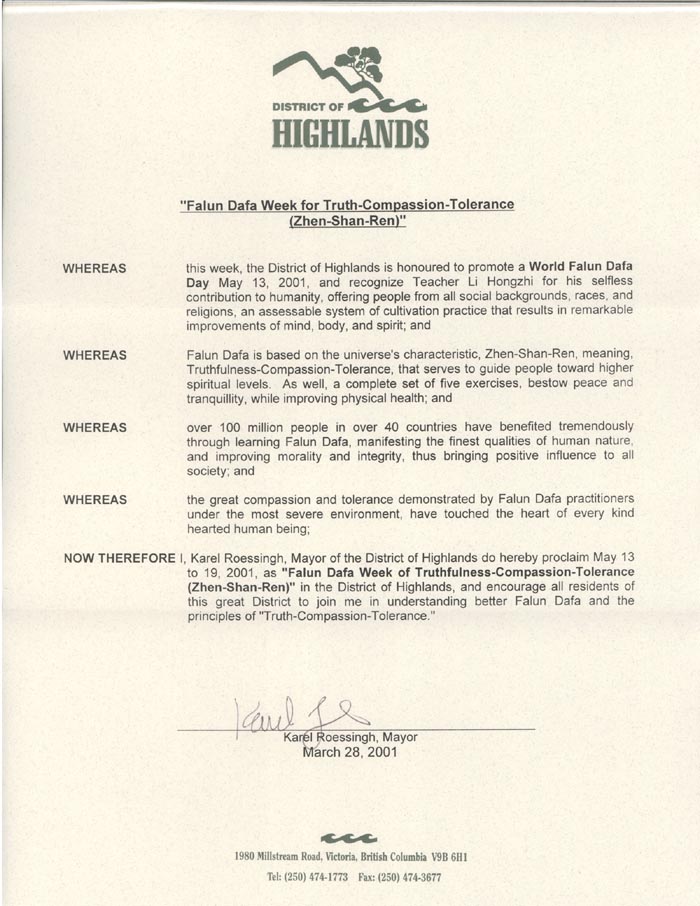 【明慧网2001年4月9日】 加拿大不列颠哥伦比亚省高地区宣布2001年5月13日至19日为“法轮大法真善忍周”。