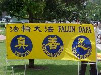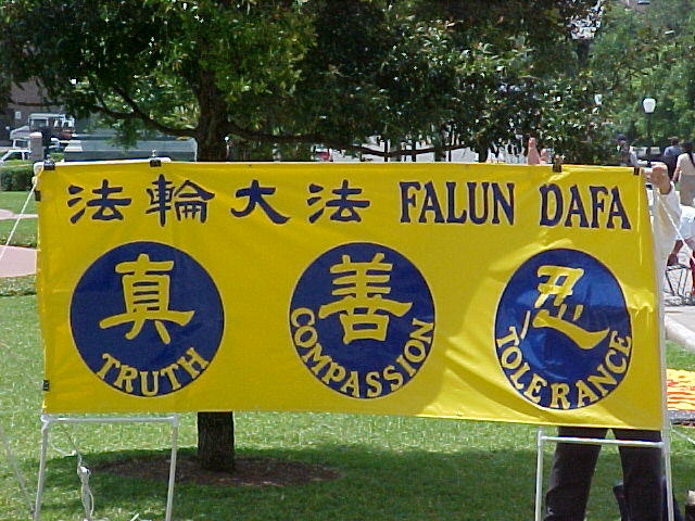 于五月十日星期四凌晨,休士顿大法弟子开车前往德州的州府奥斯汀,与达拉斯、圣安东尼以及当地大法弟子汇合一起在州议院前洪法。从上午九点开始,在州议院前摆满了各种横幅,如:中英文字法轮大法真、善、忍;彩色法轮图型金光闪闪。以及其他字,如:中国:停止镇压法轮功。中国法轮功学员被迫害的图片与各种洪法资料等。一位中年美国人一见到大法弟子身上的黄T恤的字:法轮大法,真、善、忍,马上要求一件黄T恤,他说:我最喜欢真、善、忍这三个字的含义,您们一定要满足我的要求。一位大法弟子将身上的黄T恤给了他,他立即穿上满意而去,不一会儿,他与他妻子同来观看洪法图片。这天来州议院观览的游客很多,也有些是来州议院办理公务的人员,也有个别团体来州议院前举着牌子、边走边喊口号表达他们的意见,让警察处于紧张状态。而大法弟子则在州议院前静静地炼功,非常宁静祥和,由此却引起游客,办事人员的高度注意,纷纷来到炼功队伍前,主动索取大法资料,并且询问一些问题。有些一直在观看炼功,个别的还模仿着炼功动作。有些读着横幅上的字,有些拍下或录下大法弟子炼功镜头,一位青年美国人竖着大拇指,敬佩地对大法弟子说:法轮大法。警察对大法弟子微笑着。