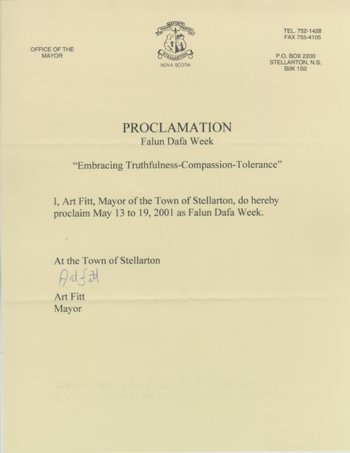 【明慧网2001年5月13日】加拿大诺瓦斯堪地亚省斯蒂利亚腾镇宣布2001年5月13日至
