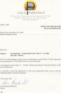 【明慧网2001年5月13日】加拿大不列颠哥伦比亚省帕克斯威利市宣布2001年5月13-19日为“法轮大法周”。