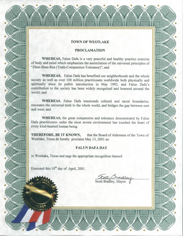 德克萨斯州西湖市宣布“法轮大法日”