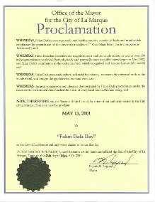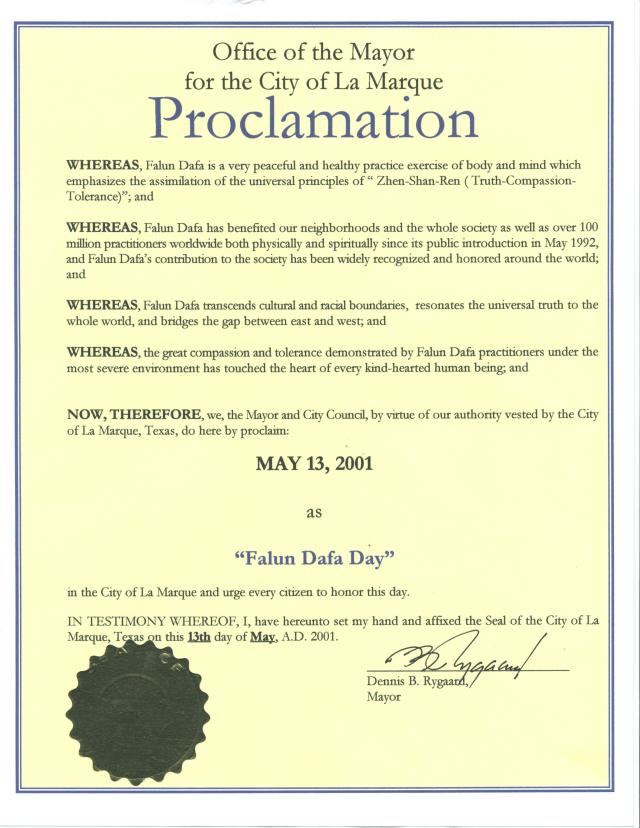 【明慧网2001年5月13日】德克萨斯州拉.马克市市长宣布2001年5月13日为“法轮大法日”。
