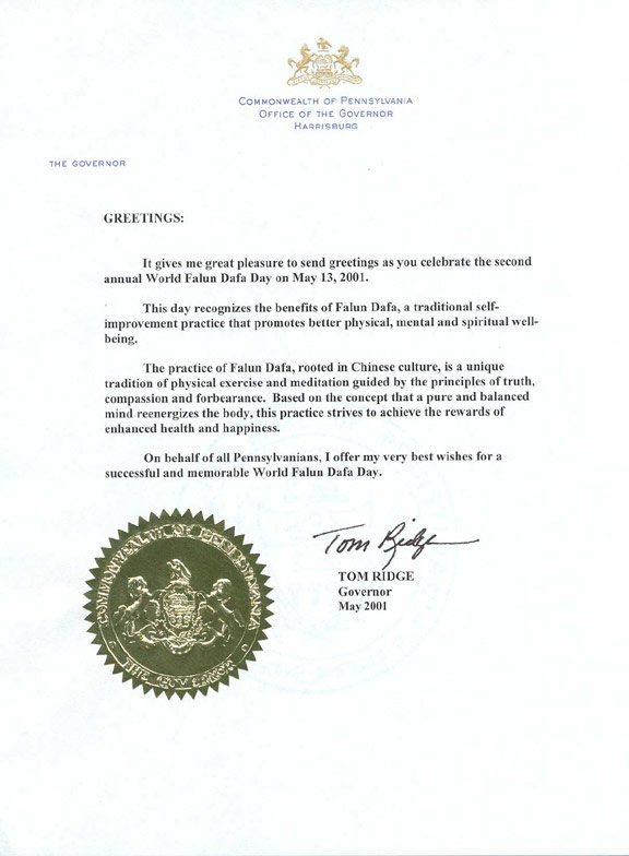 我代表所有宾西法尼亚居民,把我最最美好的祝福送给你们:祝愿一个成功的、有纪念意义的世界法轮大法日。