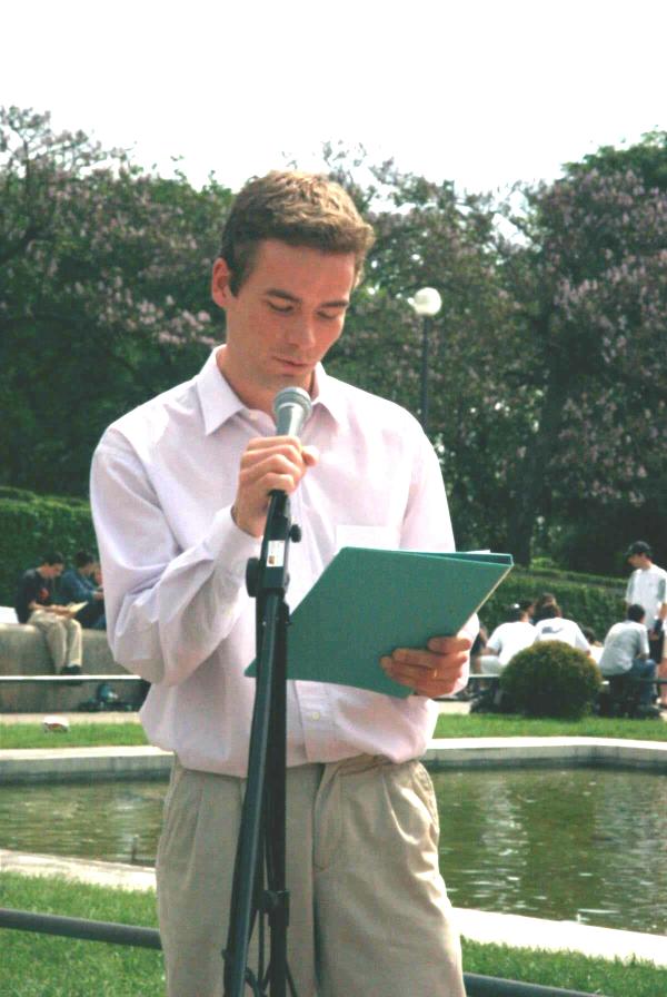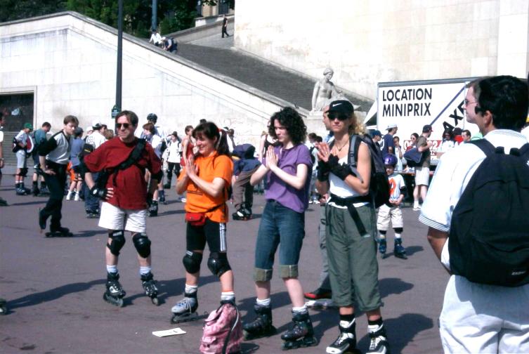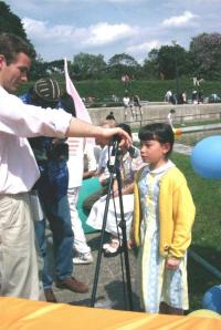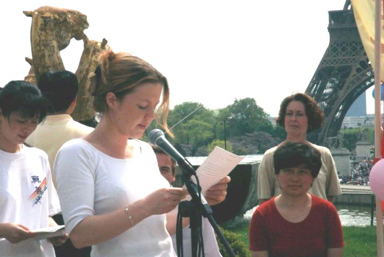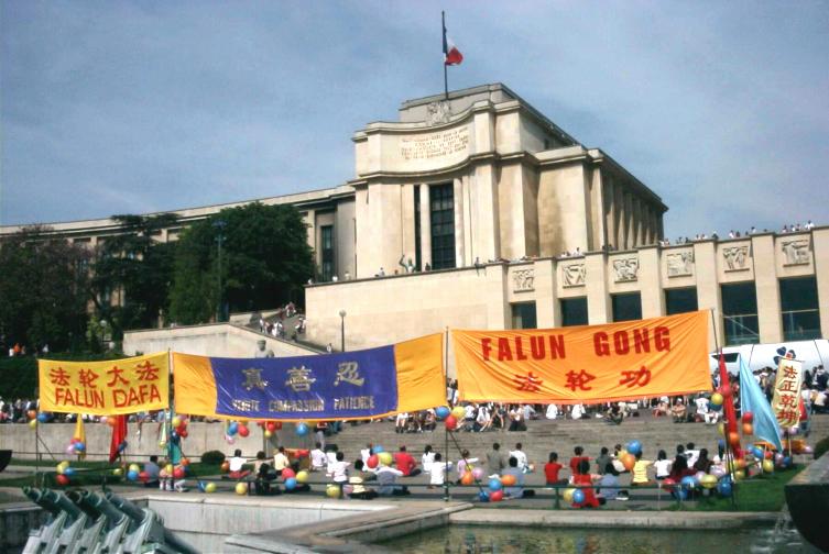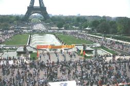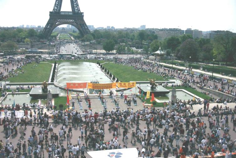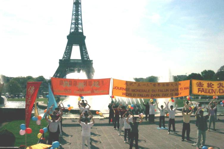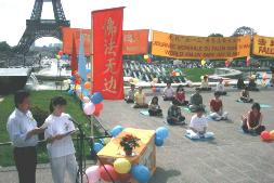 【明慧网二零零一年五月十四日】2001年5月13日,为纪念师父传法九周年及第二届世界法轮大法日,法国弟子在巴黎埃菲尔铁塔前进行了集体炼功及图片展活动,向来自世界各地的游客介绍法轮大法,并揭露江泽民政府对“真善忍”和法轮功学员的残酷