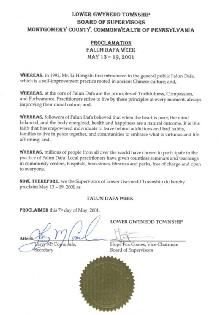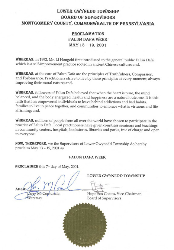 【明慧网2001年5月14日】宾西法尼亚州低贵内德镇宣布2001年5月13日至19日为“法轮大法周”