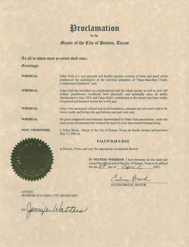 【明慧网2001年5月14日】德州等特市市长宣布2001年5月13日为“法轮大法日”。